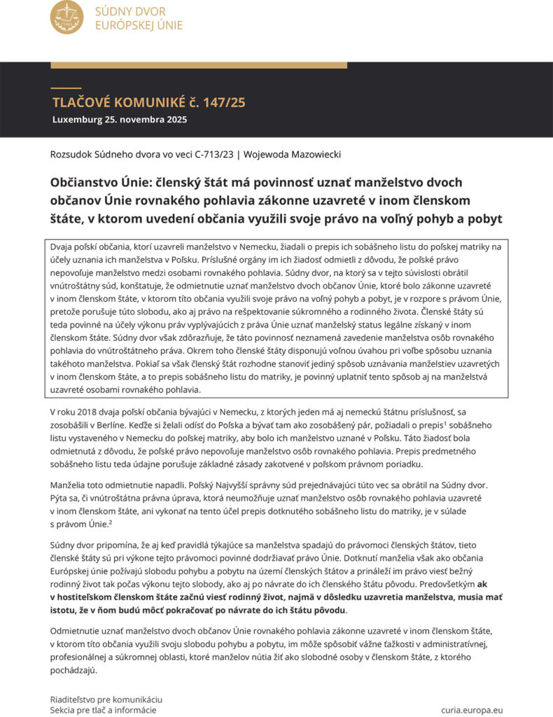 Rozsudok Súdneho dvora EU o uznávaní manželstva osôb rovnakého pohlavia